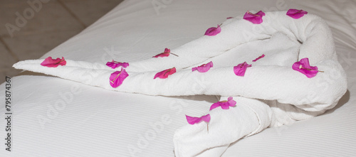 Creative cleaning of rooms in hotels in Egypt. The bed is decorated with objects made of towels.