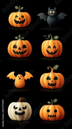 Creative Halloween pumpkin designs displayed on a dark background showcasing various spooky expressions