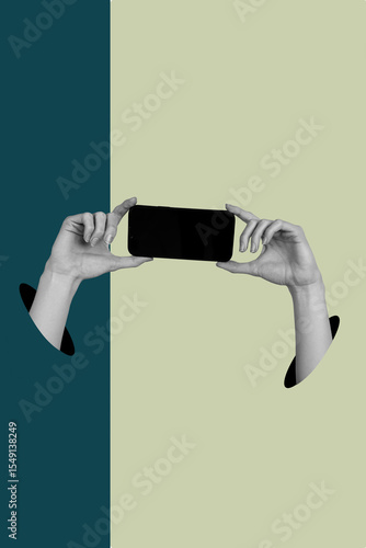 Creative vertical art banner collage of hand hold showing gadget phone mobile gadget technology gaming controller imitation