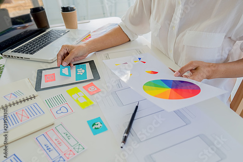 Creative Web Designer planning application and developing template layout, framework for mobile phone. User experience (UX) concept.