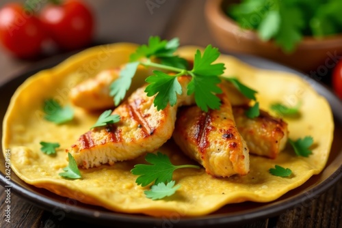 Crispy corn tortilla topped with tender grilled chicken and fresh cilantro , plate food, tortilla