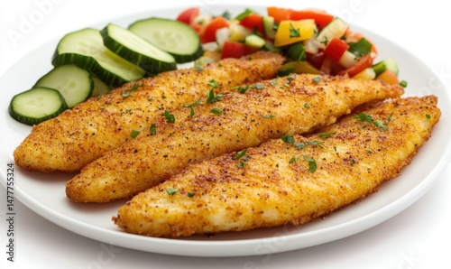 fish, crispy, salad, meal, healthy, food, dinner, plate, delicious, seafood, cooking, receipe, eatery, lunch, tasty, cookery, epicure, diet, nourishment, protein, vegetable, cucumber, pepper, tomatoes, fresh, summer, eat, side, dish, white, background, isolated, photo, stock, image
