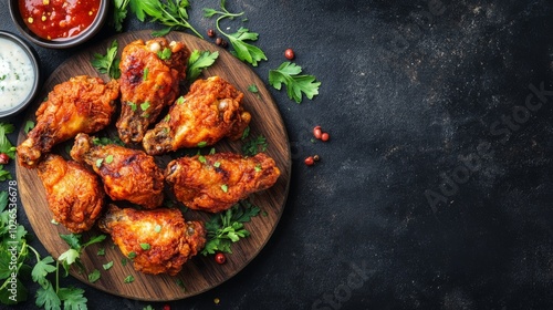 chicken, wing, crispy, fried, parsley, dipping, sauce, sauce, red, white, brown, wooden, board, plate, black, background, food, snack, tasty, delicious, savoury, meal, dinner, lunch, eat, epicure, fresh, healthy, favor, favor, spice, spice, peppercorn, pepper, kitchen, table, top, view, overhead, still life