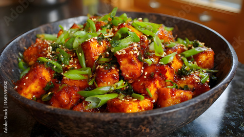 Crispy Korean fried chicken with spicy sauce and sesame seeds, close-up shot