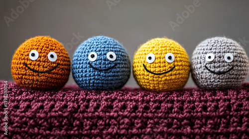 Crochet Smiling Emoji Balls on a Knitted Surface with Orange Blue Yellow and Gray Colors