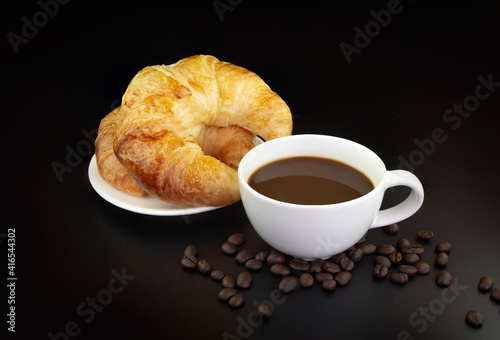 Croissants on a plate with a cup of espresso coffee and coffee beans on black background