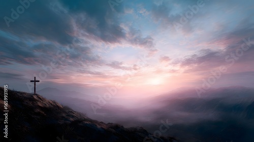 cross, sunrise, spiritual, awakening, mountain, spirituality, faith, landscape, cloud, sky, light, mist, dawn, dusk, glow, peak, silhouette, symbol, hope, calmness, nature, serenity, scenery, atmosphere, dramatic, aethereal, awe, wonder, solitude, journey, contemplation, devotion, nirvana, stillness, majesty, elevation, summit, ascent, clarity, perspective, renewal, transformation, meditation, purity, peace