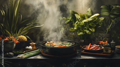 Culinary adventure in a cozy kitchen hot pot cooking botanical delights warm atmosphere artistic presentation