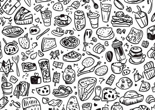 food, drink, hand-drawn, illustration, collage, vignetting, cookery, beverage, eating, meal, dish, kitchen, drink, cafes, eatery, bakery, ingredient, menu, pattern, design, art, cooking, delicious, tasty, appetising, assortment, sweet, pastry, dessert, water, hot drink, tea, juice, fruit, vegetable, drawing, style, graphic, collection, element, pattern, background, decoration, artistic, creative, homemade, epicure
