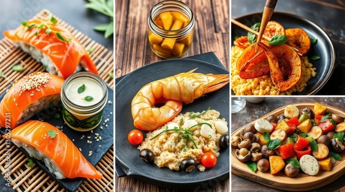 Culinary Delights: A vibrant collage of gourmet dishes showcasing seafood, risotto, grilled vegetables and sushi presented in an artistic way.
