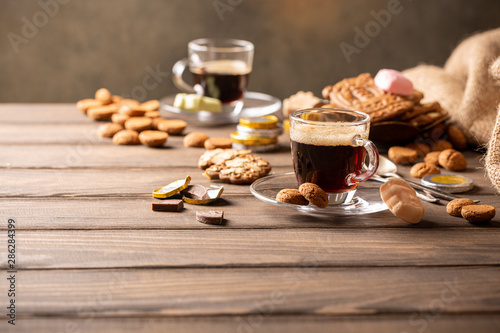 Cup of coffee with traditional sweets for Dutch holiday Sinterklaas, festive breakfast, st. Nicolas day concept. Copy space.
