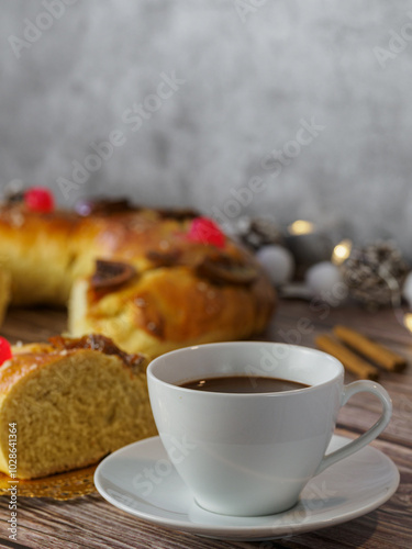 Cup of hot chocolate with a piece of Roscón de Reyes typical of Christmas
