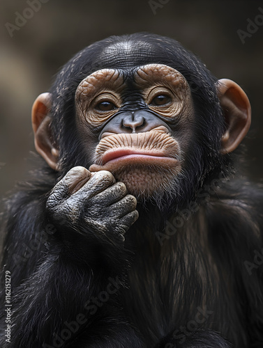 chimpanzee, contemplation, curious, zoo, reflective, wildlife, cute, expression, environment, behaviour, emotion, relaxing, social, character, playful, scenery, paw, face, gaze, wonder, fur, unique, peaceful, innocence, wild, serene, exploration, study, vibrant, connection, visual, perception, interest, life events, observation, close, sharpened, thinking, primate, conservation, intelligent, thought, glance, surrounding, clarity