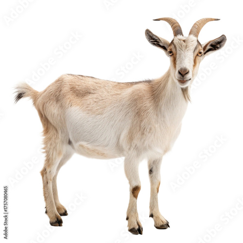 Curious, well-groomed goat with elegant horns stands attentively, perfect for farm, nature, or whimsical projects seeking charming livestock imagery.