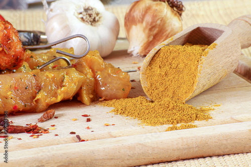spice, food, ingredient, chicken, meat, skewer, yellow, turmeric, cookout