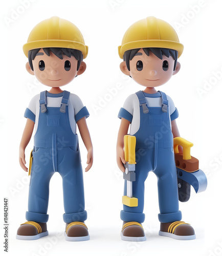 Cute 3D Illustration of Construction Workers in Hard Hats and Overalls with Tools, Perfect for Children's Educational Content and Themed Decor.