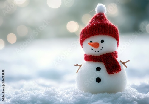 Cute and Cheerful Snowman Wearing Red Hat and Scarf on Snowy Background with Soft Bokeh Lights Creating a Magical Winter Atmosphere
