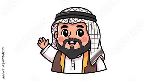 Cute Arabian man in traditional keffiyeh clothing waving hand, vector cartoon character