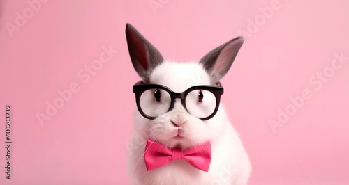 Cute decorative rabbit with glasses and a bow around his neck on a pink background. Generative ai.