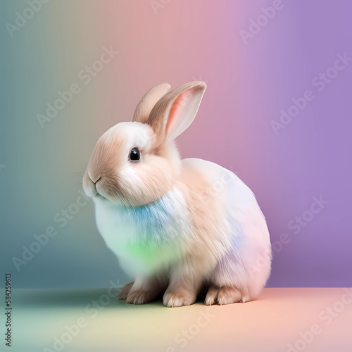 cute fluffy furry easter rabbit on white background rainbow lights sitting