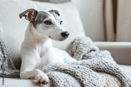 Cute Jack Russell Terrier relaxing on a cozy sofa under a warm knitted blanket