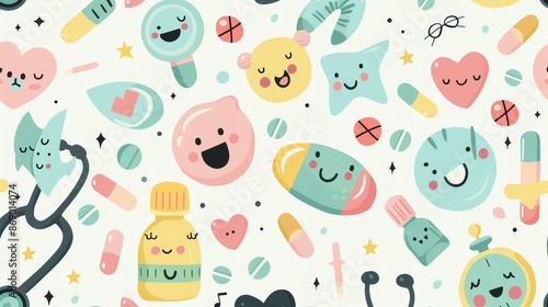 medicals, pattern, background, cute, health care, health, medicine, illustration, cartoon, design, seamless, repeat, hospital, doctor, nurse, clinic, pharmacy, prescription, pill, capsule, stethoscope, nubes, sticking-plaster, dropper, bottle, clock, first aid, wellness, treatment, children, children, pastel, sweet, adorable, smiling, happy, graphic, wallpaper