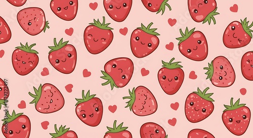 strawberry, cute, happy, red, fruit, heart, pink, background, pattern, design, illustration, sweet, adorable, cartoon, berry, food, wallpaper, textile, repeat