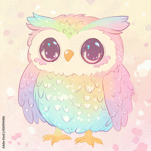 Cute pastel owl illustration featuring a kawaii design with vibrant colors and big sparkling eyes