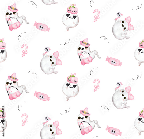 Cute Pink Halloween Ghost Watercolor Pattern Seamless Background