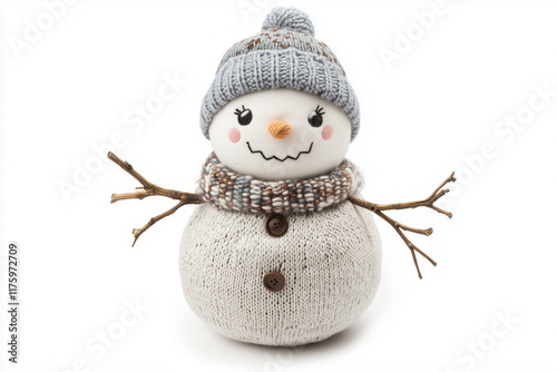 Cute plush snowman with a knitted hat and scarf isolated on a white background