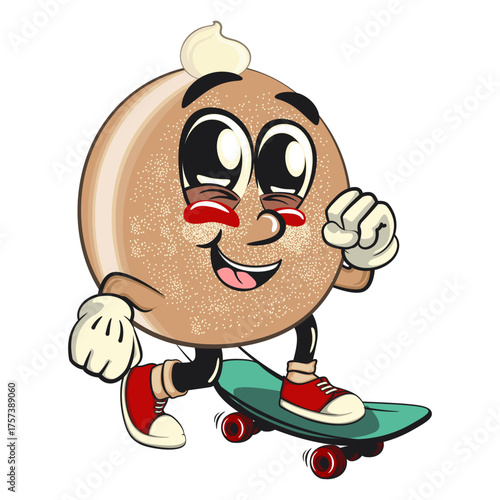 donut, bun, donut, skateboard, sugar, bakery, cute, cartoon, mascot, dessert, food, clip art, vector, illustration, breakfast, skater, urban, game, sport, pastry, snack, business, sticker, t-shirt, clothing, store, sweet, delicious, funny, tasty, character, happy, isolated, icon, good, comic, epicure, hot drink, organic