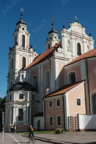 Cyclist passes by strawberry and cream Baroque Church of St Catherine, Old Town, UNESCO Wolrd Heritage Site, Vilnius, Lithuania