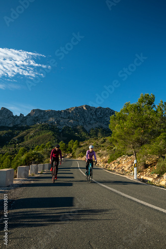 alicante, cycling, bicycle, spain, woman, destination, asphalt, landscape, two people, adults only, climbing, color image, determination, effort, endurance, exercising, freedom, headwear, healthy lifestyle, hill, horizontal, journey, lifestyle, man, motion, mountain, outdoors, people, photo, riding, road, sport, springtime, summer, sunlight, sunny