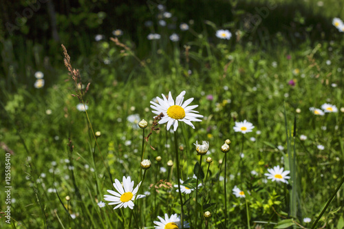 flower, green, chamomile, colours, white, summer, wildflower, springtime, daisy, plant, beauty, nature, landscape, sunlight, meadow, yellow, outdoors, herb, field, head, blossom, closeup, growth, lawn, day, grass, light, people, sun, family, season, uncultivated, shiny, garden, group, formal, composition, medium, rural, scenic, lush, image, idylli, single, tranquil, background, botany, purity
