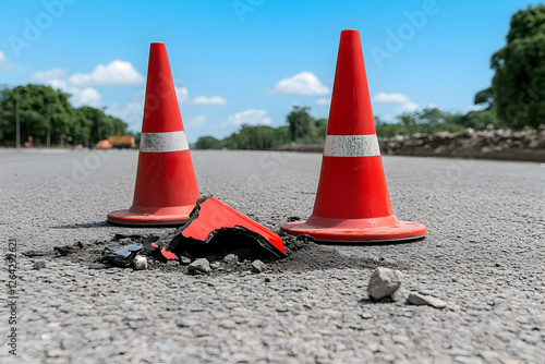 asphalt, road, cone, highway, repair, maintenance, damaged, construction, traffic, street, warning, safety, cone, orange, surface, work, signs, transport, barrier, alert, urban, texture, transportation, city, travel, material, vehicle, block, background, infrastructure, danger, caution, route, concrete, closeup, patch, rough, nobody, pattern, accident, tar, element