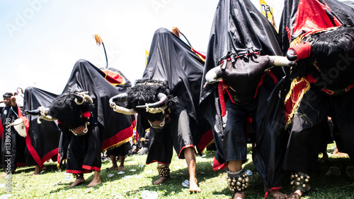 dancers in Bantengan dance costumes with buffalo or bull heads with black cloth