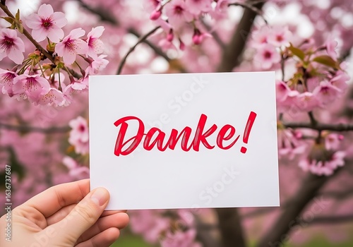 thank, you, thank, gratitude, appreciation, card, message, writing, hand, holding, flower, blossom, tree, spring, pink, nature, floral, season, greeting, gesture