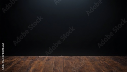 Dark background with wooden floor and black wall A wooden floor with a black wall in the background Wooden table with black wall background for product display presentation mockup design, 2