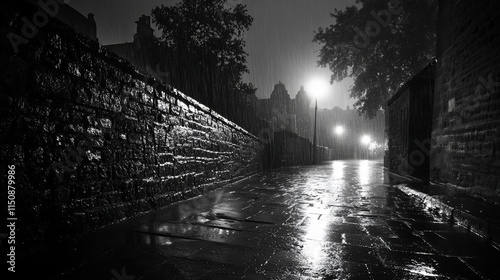 night, rain, city, street, alley, dark, wet, cobbled, urban, monochrome, black, white, light, shadow, wall, mysterious, moody, atmosphere, lamp, road, town, architecture, building, travel, scene, evening, weather, water, stone, pavement, old, vintage, dramatic, black, mystery, alone, empty, quiet, peaceful, calm, serene, solitude, loneliness, darkness, gloom, film, photo, background