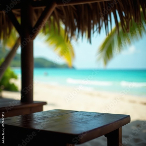 Dark wood bar, palm fronds overhang, blurred beach scene, counter top, palm leaves, brown