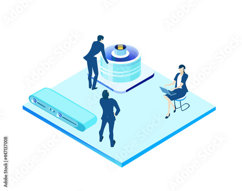 Data center concept with business people. Isometric working space, business people working together in server room, analysing data, solving problems, find solutions. Support idea