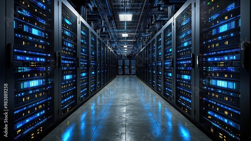 Data Center Server Room Rows of Servers with Blue Lights Network Technology