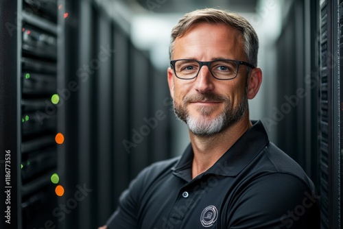 Data Center Specialist: A confident and experienced IT professional stands proudly in a server room, his glasses reflecting the soft glow of the data racks behind him.