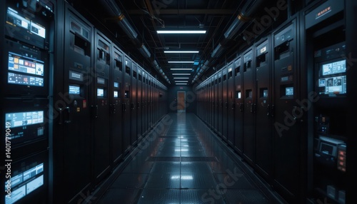 Data protection retention concept. A dark, high-tech data center corridor lined with server racks, illuminated by soft blue lights, creating a futuristic atmosphere.