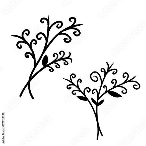 floral, tree branch, silhouette, vector, decorative, ornament, botanical, plant, leaf, foliage, nature, design, pattern, black, simple, minimal, elegant, swirl, flourish, vintage, element, art, illustration, doodle, curly, decoration, garden, organic, stem, natural, outline, clip art, minimalist, hand-drawn, wild plant, vine, black-and-white