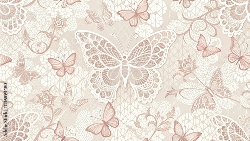 Delicate abstract seamless lace pattern with intricate floral motifs and fluttering butterfly silhouettes in soft pastel hues , nature patterns, floral patterns