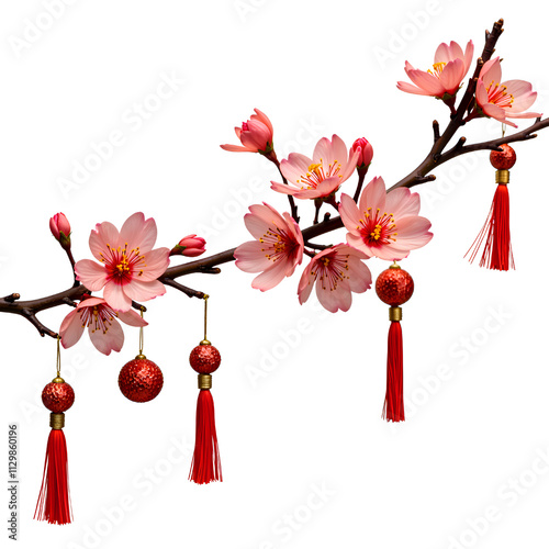 Delicate cherry blossom branch adorned with festive red tassels and orbs, photography of floral arrangement concept.