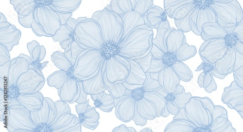 Delicate floral pattern, pastel blue and white, overlapping petals, soft watercolor effect, vintage wallpaper design, seamless repeat, subtle shading, botanical illustration style, dreamy atmosphere,
