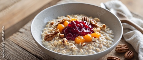 Delicious bowl of oatmeal topped with fruit preserve and nuts served on a wooden table during breakfast time.