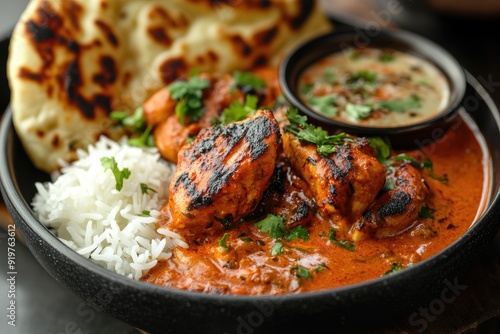 Delicious chicken tikka masala with rice and naan bread on dark background